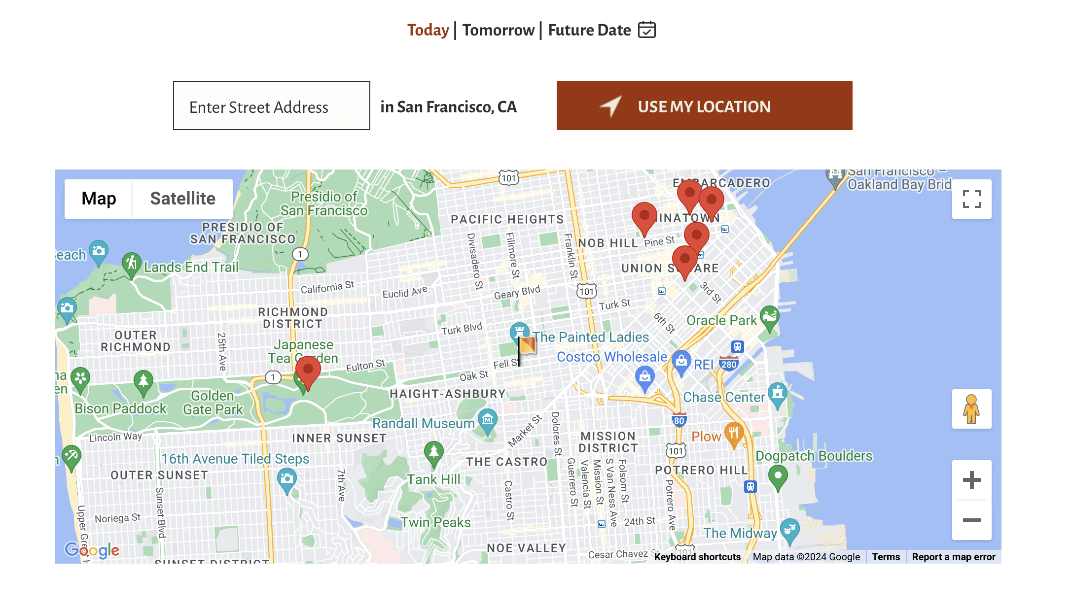 Imagine you are a visitor to San Francisco and you would like to take a walking tour. You could click over to the San Francisco City Guides web site and find a tour on Find Your Tour: Find Tours Near Me. This page displays a map based on your location, the date, and the list of tours on that date.
