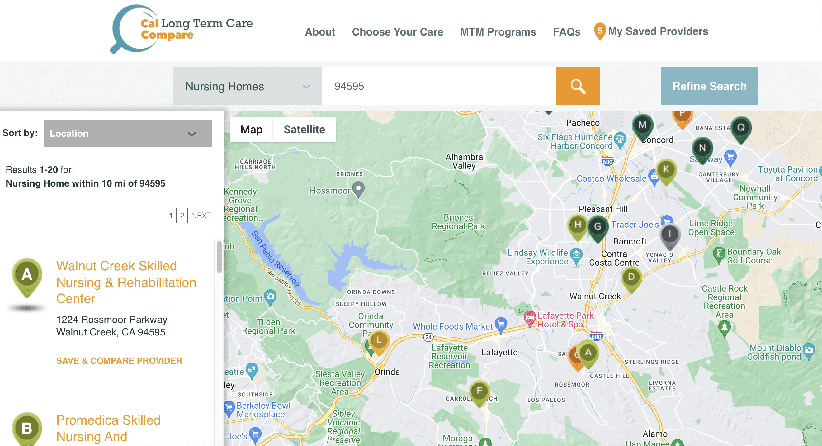 You want to find a well rated California long term care facility or a hospital, or check up on one you already know. The Cal Hospital Compare website and the Cal Longterm Care Compare website have you covered. When you search for facility ratings, because that’s what they provide, you can see a map of the area you are targeting with pins for the facilities in the area. When you click through to the facility rating page, you can see a small zoomed in map of the facility location. Helpful again!