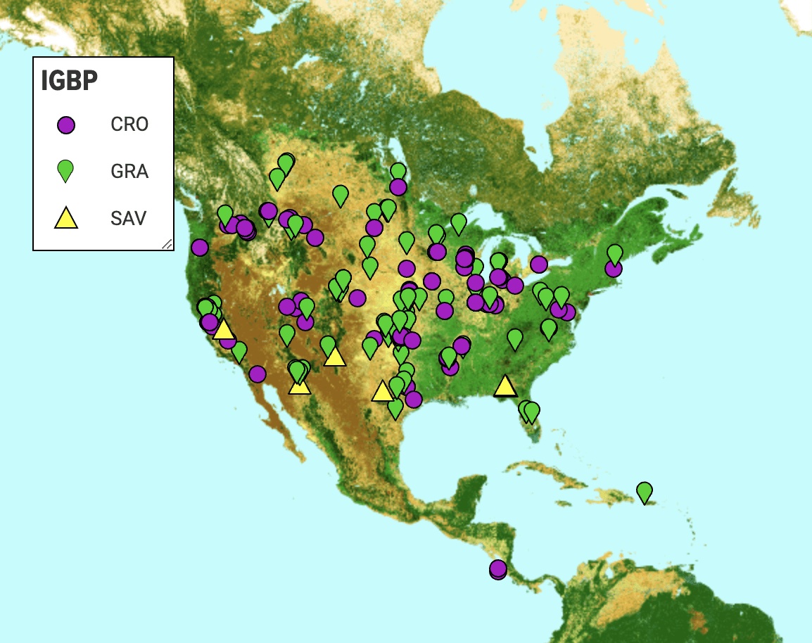 On the AmeriFlux site search map, more cool features besides directions are available for researchers to customize a map. A map can be assigned a title and the background of the map can be changed to indicate terrestrial features. Also, the pins on the map can be styled with colors and shapes you assign based on data characteristics. There’s an optional legend for those pins that you just colored and shaped. Pins have popup labels with info for each site. And, the maps are downloadable as pngs (doesn’t work on Safari).